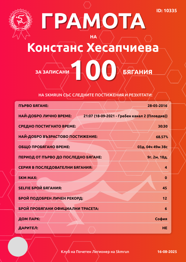 | Борисова градина (София) | 20 | 24.08.2019 | 198 | 37:13 | 49 | 28 - 25-29г. | няма | 52 |