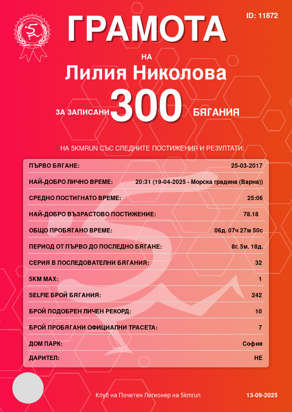 | София Екиден Маратон | 5 | 06.09.2019 | 96 | 23:15 | 11 | 6 - 40-44г. | няма | 90 |