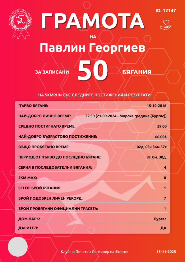 | Морска градина (Бургас) | 578 | 20.09.2025 | 59 | 24:50 | 45 | 8 - 40-44г. | няма | 56 |