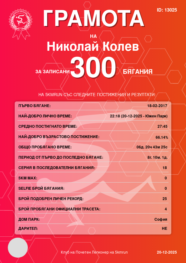 | Западен парк 2 | 344 | 06.12.2025 | 32 | 24:20 | 26 | 6 - 50-54г. | няма | 75 |