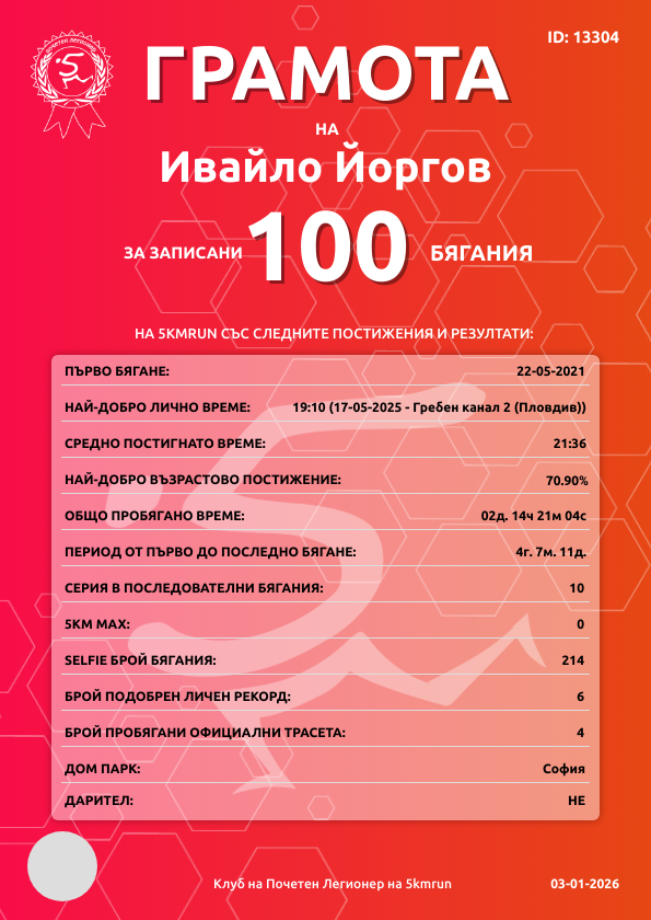 | Парк Лаута (Пловдив) | 470 | 24.05.2025 | 3 | 20:44 | 3 | 1 - 40-44г. | няма | 98 |