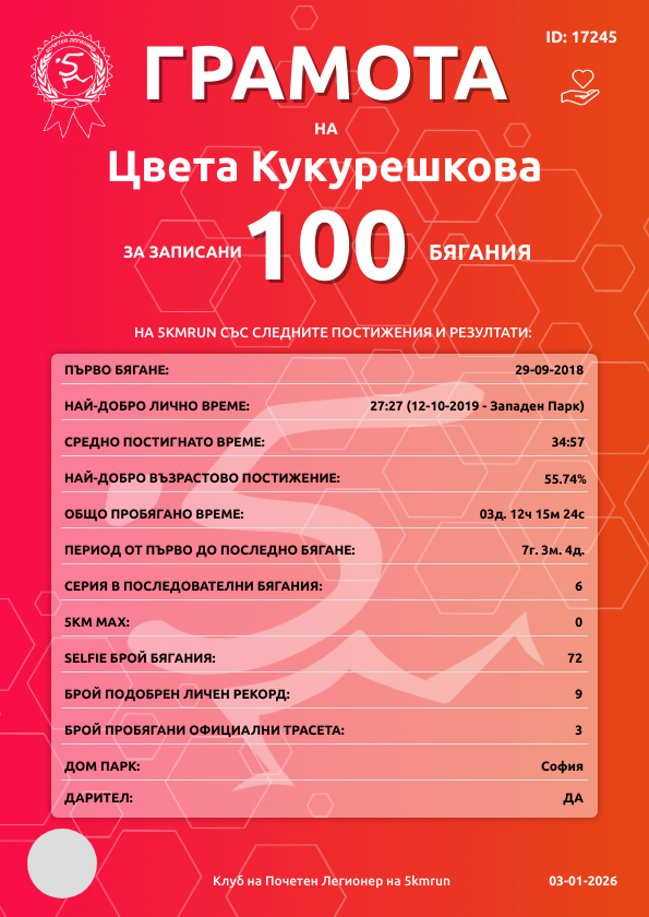 | Западен парк 2 | 167 | 02.07.2022 | 60 | 35:30 | 19 | 13 - 45-49г. | няма | 82 |