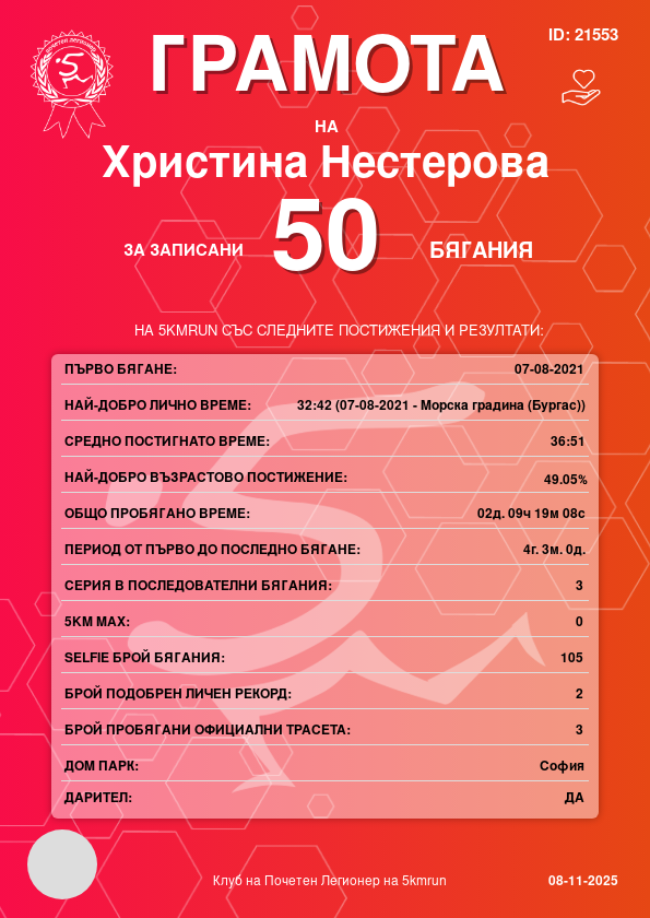 | Морска градина (Бургас) | 468 | 12.08.2023 | 128 | 37:52 | 30 | 14 - 45-49г. | няма | 71 |