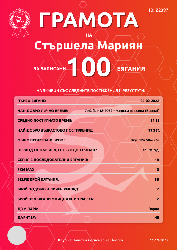 | Морска градина (Варна) | 454 | 17.09.2022 | 1 | 18:32 | 1 | 1 - 40-44г. | няма | 100 |