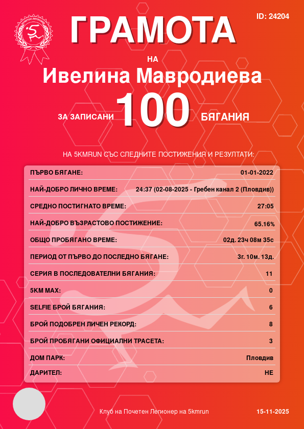 | Парк Лаута (Пловдив) | 481 | 09.08.2025 | 32 | 27:50 | 3 | 5 - 45-49г. | няма | 98 |