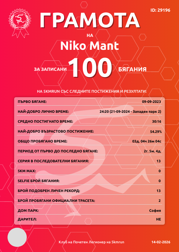 | Западен парк 2 | 267 | 08.06.2024 | 34 | 28:05 | 29 | 5 - 35-39г. | няма | 72 |