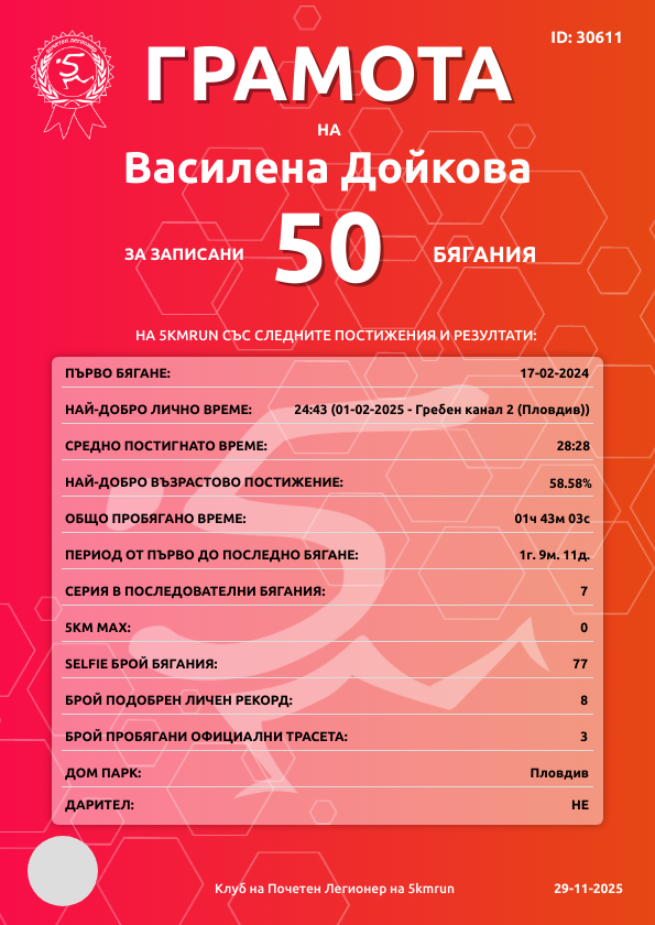 | Парк Лаута (Пловдив) | 493 | 01.11.2025 | 39 | 28:18 | 5 | 5 - 25-29г. | няма | 96 |