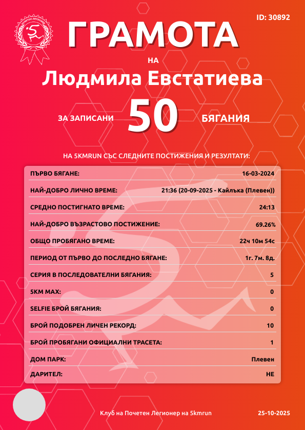 | Кайлъка (Плевен) | 121 | 27.09.2025 | 50 | 33:55 | 11 | 10 - 35-39г. | няма | 90 |