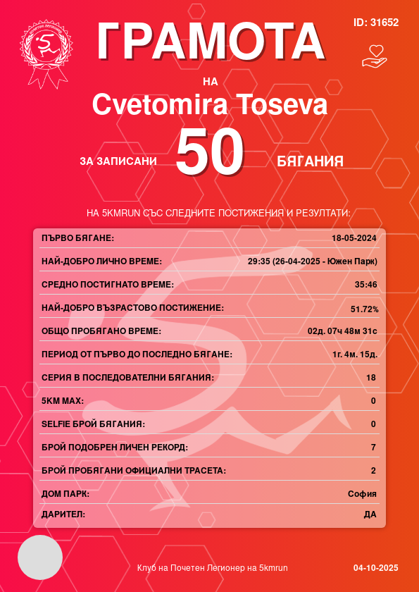 | Южен Парк | 564 | 02.11.2024 | 350 | 35:05 | 88 | 54 - 40-44г. | няма | 13 |