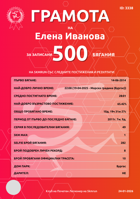 | Морска градина (Бургас) | 536 | 30.11.2024 | 29 | 23:39 | 3 | 4 - 25-29г. | Runners Burgas | 98 |