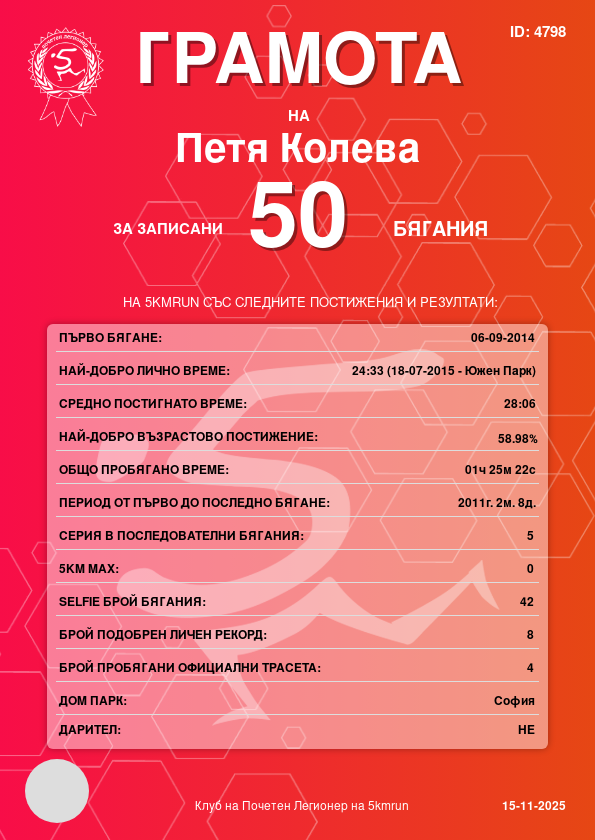 | Борисова градина (София) | 1 | 24.05.2015 | 180 | 30:21 | 37 | 58 - 25-29г. | няма | 64 |