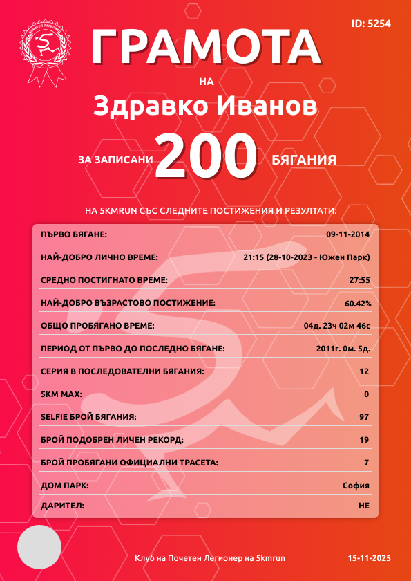 | Борисова градина (София) | 18 | 10.08.2019 | 143 | 29:41 | 94 | 40 - 30-34г. | няма | 7 |