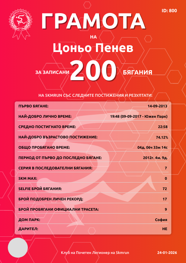 | Борисова градина (София) | 4 | 04.05.2019 | 38 | 22:21 | 35 | 5 - 45-49г. | няма | 66 |