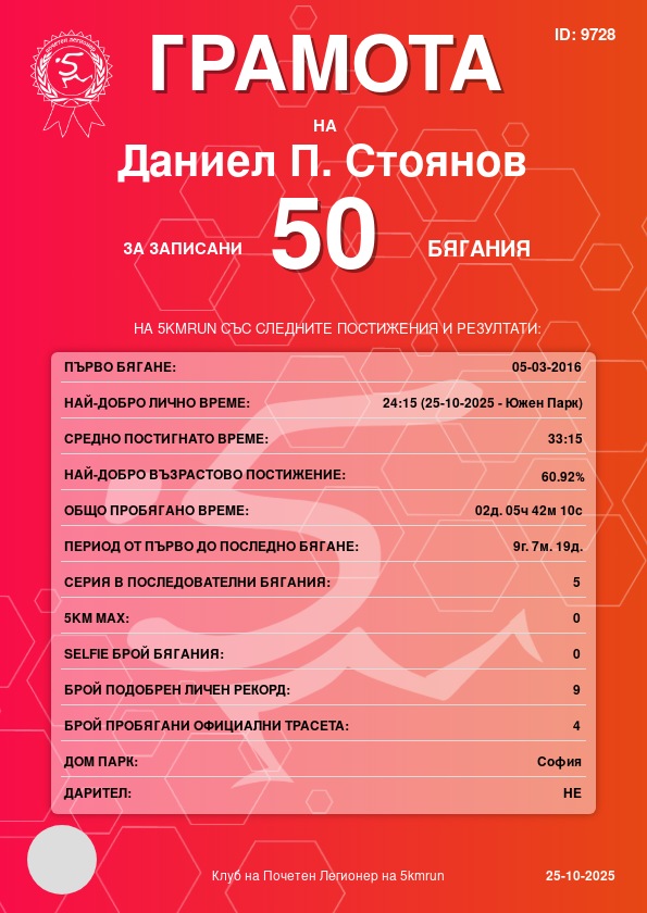 | Борисова градина (София) | 1 | 13.04.2019 | 231 | 39:05 | 150 | 9 - 8-14г. | няма | 1 |